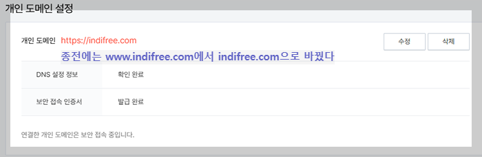 그래서 www를 빼고 다시 티스토리에서 재 등록을 해 놓았고 현재처럼 발급도 완료가 된 상태가 되었다.