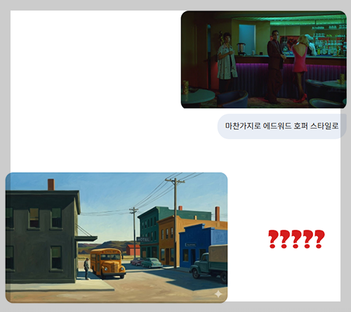 AI의 오류: 사용자가 '이미지 1의 화풍'을 유지하면서 내용을 수정해달라고 요청했을 때, AI는 이미지 1의 구체적인 내용(실내 바, 인물들)보다 **'에드워드 호퍼 스타일의 풍경'**이라는 추상적인 특징을 더 강력한 문맥으로 받아들였을 가능성이 높습니다.