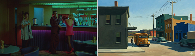 두 이미지 모두 에드워드 호퍼(Edward Hopper) 풍의, 고독하고 정적인 사실주의 화풍을 띠고 있습니다.